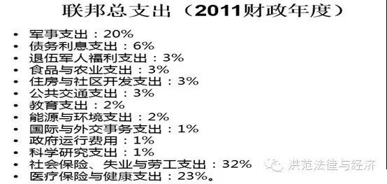 第二,人们不能从税收中得到很多的好处。这是“美国联邦总支出(2011财政年度)”(见下图)。大家看,随便简单地加一加,跟民生有关的支出在72%以上,如果要是把跟它有关系的债务利息也算进去,将近78%,也就是说政府的运行费用只有1%,军事支出高一点,20%,两者加在一块才20%多一点。也就是说,人民从税收中得到的福利是有目共睹的,是可以拿数据证明的。但是,人们还是不喜欢税收。这是美国的情况,它还不是一个纯福利国家,它只能算一个准福利国家。如果是一个纯福利国家,军费可能还要低,福利支出还要高,这个我们可以找数据去看。