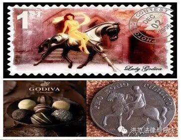 死寂的街道,没有一个人,甚至连窗户都没有人打开,就是说没有人偷看伯爵夫人光着身子是什么样的。为什么?人们以此来表达对这位夫人的尊重。这里面透射的是什么呢?没有经过城市居民同意的征税是不义的。这个伯爵是谁人们早已忘记,但保护人民利益的伯爵夫人的故事却被人们世世代代留传下来,直到现在在王府井、天津的银行广场都有她的广告。这个是一个关于税收正义的故事。你看,不光是巧克力,还有邮票、硬币,挂毯上面都有她的形象,考文垂市和英国的一些城市里面Godiva裸体骑马的铜像就有好几座(见下图)。