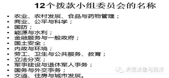 大家看,最早制订预算是总统权利,总统下面设一个OMB(总统预算办公室)预算编制,然后总统把预算草案提交给国会、参众两院来审议,整个过程非常复杂,整个周期在18个月以上,也就是在一年半之前就要编制当期的预算,这是一个非常复杂的过程。然后参众两院审议,审议完之后通过的预算交给总统,总统也可以表示异议,然后每个委员会把每个院发生的问题退回,参众两院重新审议,重审之后如果达到三分之二,总统的否决就失效了,议会就等于有这个决定权。但在仪式上,总统还要批示一下,但它有一个非常短的周期,是七天(还是十天?)。如果总统不批,就认为总统已经同意。实际上总统不同意也不行了。这就是一个权力的制约问题。另外,还有一个问题,美国的预算跟其他国家的预算不一样,其他国家有预算就可以了,美国还不放心,还要在预算的资源刀上还要锁上一道,那就是建立“预算拨款委员会”,参众两院各设12个拨款小组(见下图)。