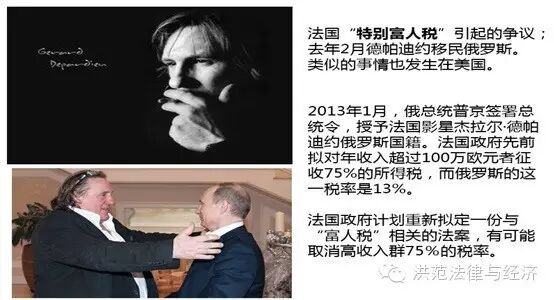 这是我刚才谈到的《经济人的末日》。关于税收正义问题一直在实践中存在争议,像法国前些年实行“特别富人税”,法国的“特别富人税”税率达到75%,那是相当高的税率。北欧的税率现在还高,曾经有些国家有些时候能够达到70%-80%,甚至比这还高,不过现在没那么高了。当然,税率如此高的原因之一是因为他们是福利国家。美国有75%的所得税的税率,相当高。法国的高税率把著名演员德帕迪约给逼走了,他到俄罗斯去了,俄罗斯总统还接见了他,这就是剥夺富人的财富所带来的一个结果(见下图)。